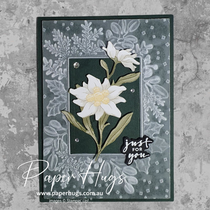 Todays card is combining the stunning Wonderful World designer series paper, vellum and embossing powder, a triple whammy for you today lol This paper is just stunning and it is a free item along with the stamp set in the latest Sale-a-bration catalogue with a purchase from my online store. It was extremely hard to cut up too, why do we do that with gorgeous paper? I chose one of the largest flowers from the dsp and fussy cut it out. I find fussy cutting quite therapeutic and relaxing but I know a lot of you are not fans at all.